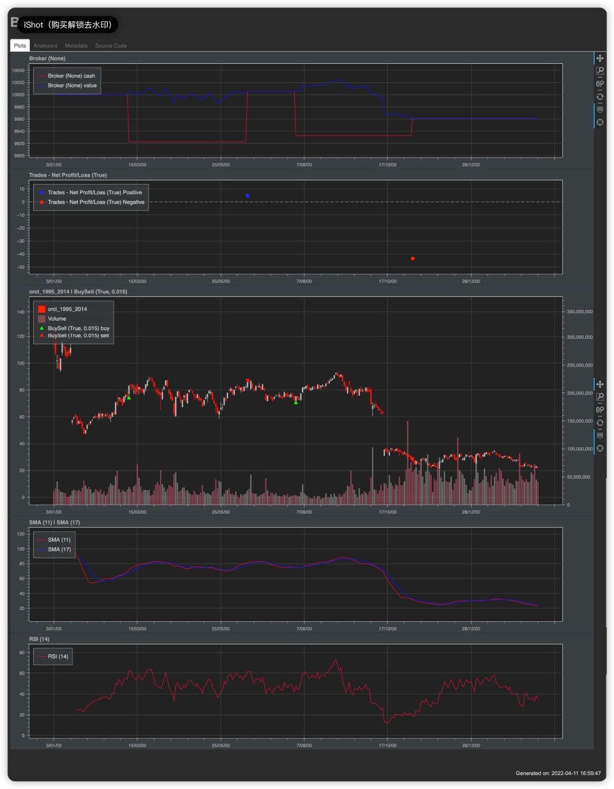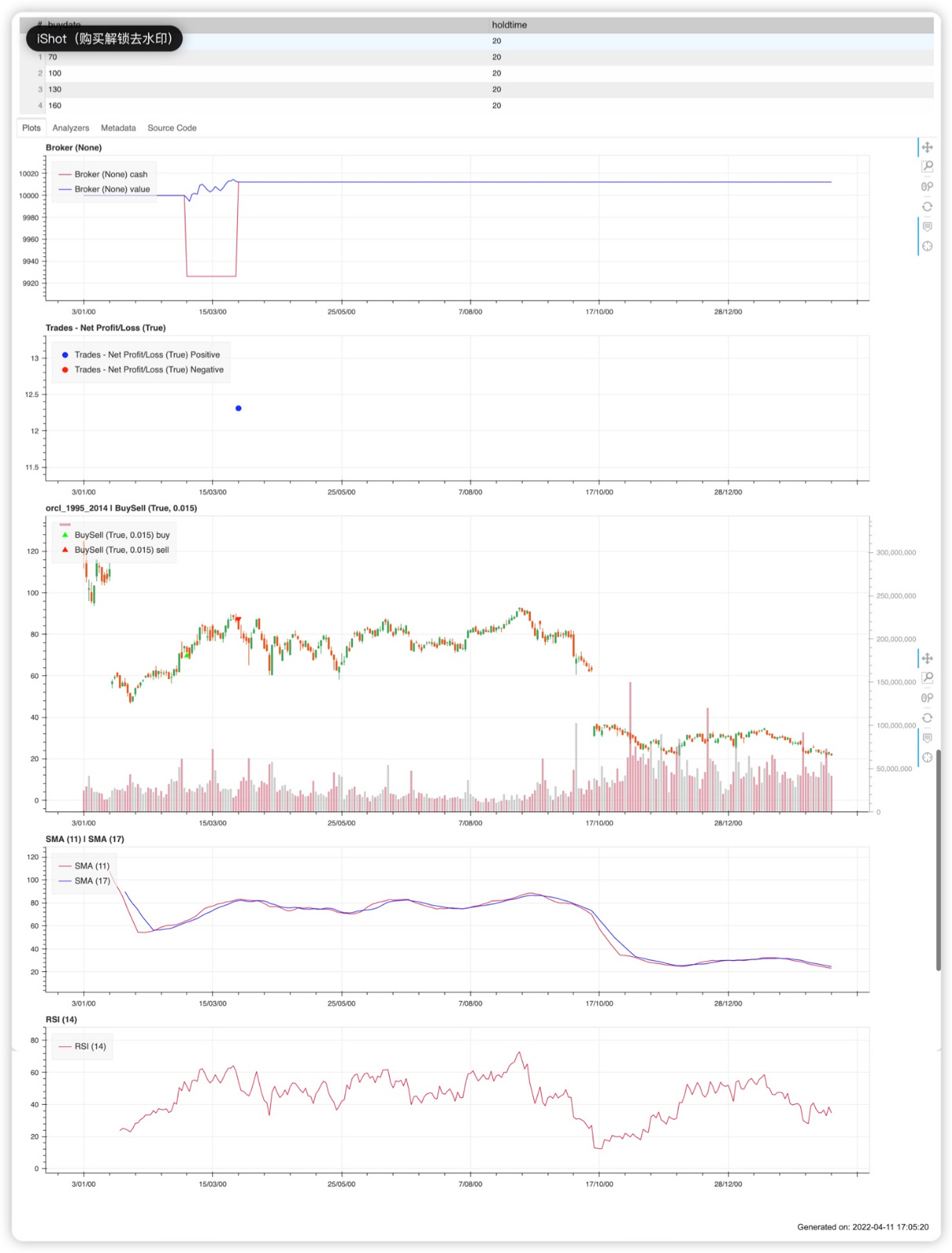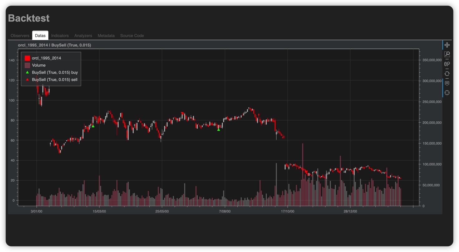 from backtrader_bokeh import bt ... ... plot = bt.Bokeh(style = 'bar', scheme=bt.schemes.Blackly(), force_plot_legend=True) # bt.schemes.Blackly is style of scheme cerebro.plot(plot, iplot=False) # if run in Jupter, need to pass 'iplot' argument in thereOptstrategy Mode is the backtest which has multi sets of strategy's argument: